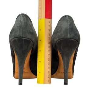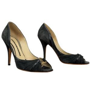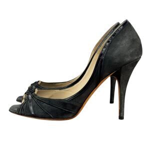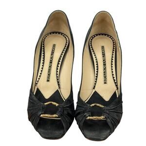 Step out in style with these stunning Jimmy Choo black suede pumps. Featuring a chic peep toe and a unique hammered gold ring detail, these heels are sure to turn heads.