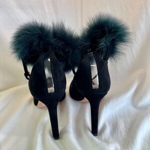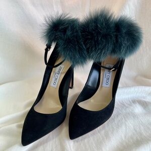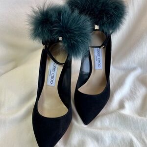 Elegant Jimmy Choo heels crafted in luxurious black suede, accented with genuine dyed silver fox fur pom poms (that are removable) from Finland. These striking pumps feature a pointed toe, slender stiletto heel, and adjustable ankle strap with beautiful dark green fur pom pom detail - the perfect blend of playful and sophistication.