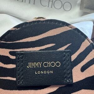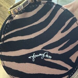 Elegant round coin pouch with zebra pattern. Features black and tan colors. Iconic Jimmy Choo branding.