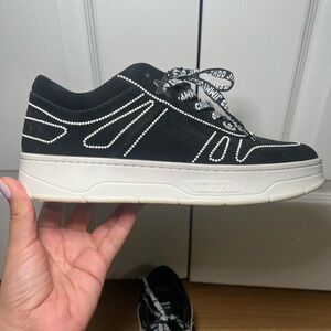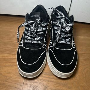 Stylish black sneakers with white accents. Features branded laces and comfortable sole.