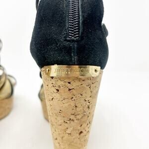 Jimmy Choo Black and and Gold Strappy Platform Cork Wedge Sandals 37.5 (7.5)