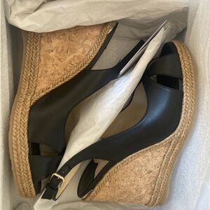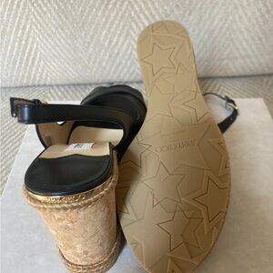 Step into luxury with these Jimmy Choo wedges, featuring sleek black leather straps and a natural cork wedge heel. The cross-over design and platform front offer both style and comfort, making them perfect for any elegant occasion.
