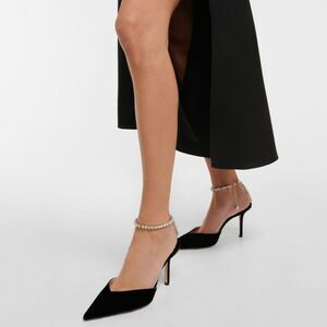 Made in Italy, this pair is decorated with a delicate crystal chain that suspends a single crystal and gently adorns the ankle like jewellery. The meticulously crafted crystals also drip gracefully down the line of the heel. Striking and statement, this pointed pair is set on a 100mm stiletto heel.
