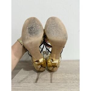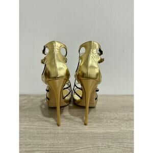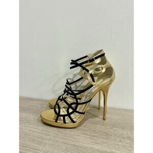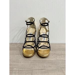 Jimmy Choo Bunting Caged Metallic Leather Strappy Heeled Sandals Black/Gold 39/9