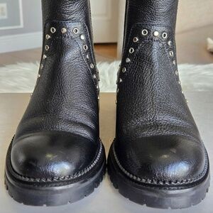 Step into edgy sophistication with these stunning Jimmy Choo Burrow Chelsea boots, crafted in rich, pebbled black leather. These ankle boots feature a classic Chelsea silhouette elevated by silver-tone stud detailing that adds a bold, modern twist. The elastic side panels ensure a comfortable fit while the rugged lug sole provides both grip and style.