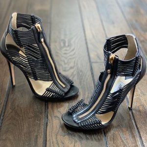 Barely worn Jimmy Choo black cage heels with gold zipper. Excellent condition, practically new