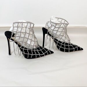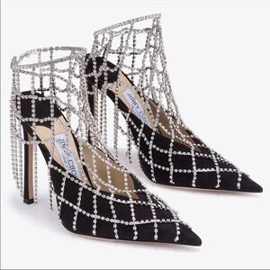 New without box Jimmy Choo Scotty 110 Black Suede Mules with Crystal Chains. Jimmy Choos runs small. Says 41 or 11 but fits more like a 10. That is why it’s listed as a 10 instead. Comes with dustbag