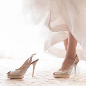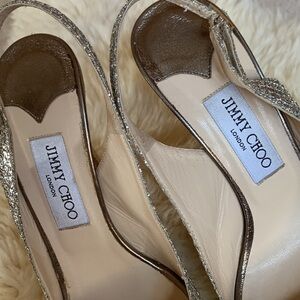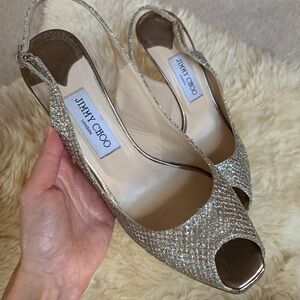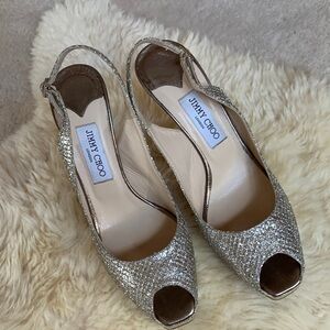 ❤️Lovely Jimmy Choo Clue Champagne Silver Gold Sparkle Slingback Platform Bridal Heels
