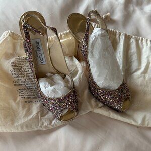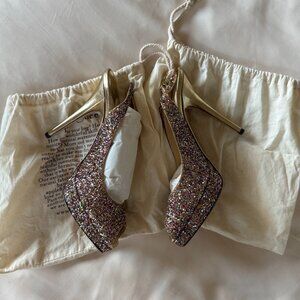 Smooth leather outlines a gorgeously glittering fabric pump styled with a flirty peep toe and narrow slingback strap.