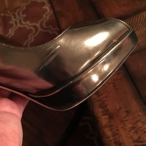 These shoes are so sexy & beautiful! They are just too high for me & I need to let them go. Some scuffs& missing color in areas. Gorgeous pewter color that goes well with black & gold & silver, too!
