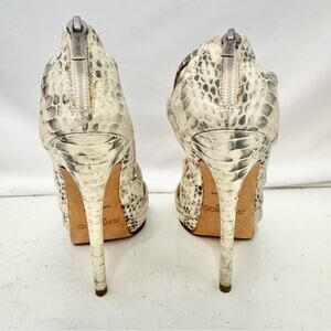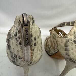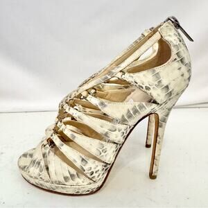 Good used condition! cream and silver snake skin print platform heels. Gladiator style with silver rivets and back zip closure with an open toe. Heel height of 4 3/4 inches. Please note some imperfections throughout. Please see all photos.
