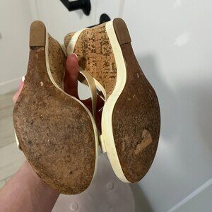 Jimmy Choo Cream Patent Leather Wedge Heel Sandals Size 35. Signs of wear near toe area, as seen in photos. Cork wedge heels. Strappy toe with adjustable straps. Heel is approximately 3.5". Size 35, which is equivalent to US size 5.