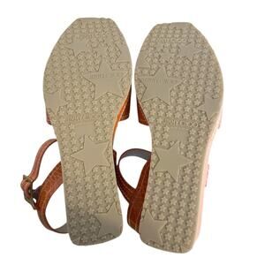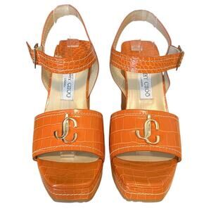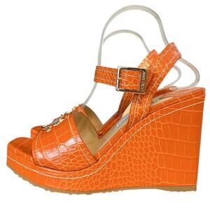 Jimmy Choo Croc Embossed Orange Leather Logo Wedge Sandals 40