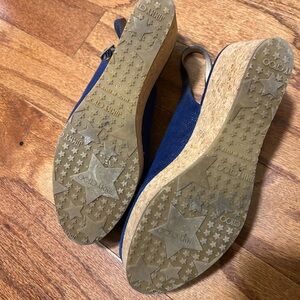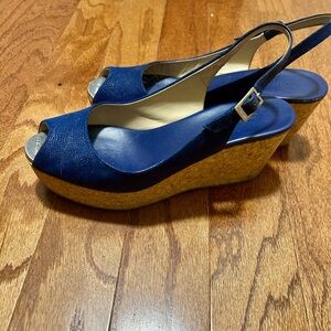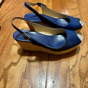 Chic dark blue slingback textured suede heels. Peep toe design. 1-1/2 inch platform