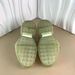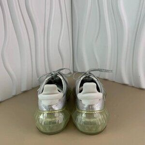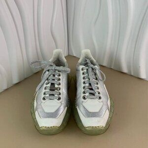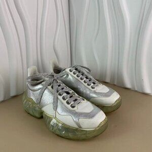These Jimmy Choo sneakers combine cutting-edge design with luxury appeal. Featuring a metallic silver upper and transparent sole, they offer a bold, contemporary look matched by comfort.