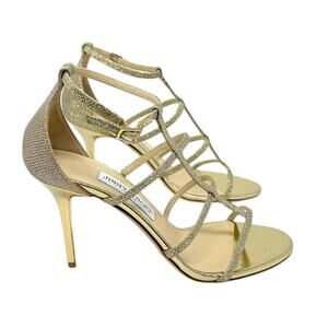 Jimmy Choo Dory Glitter Heel Open Toe Ankle Strap Sandal Gold 38