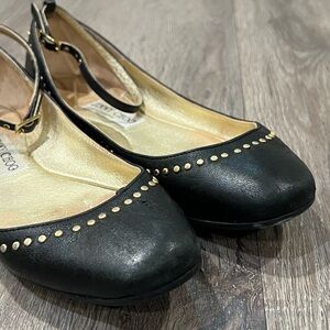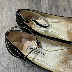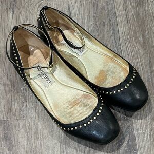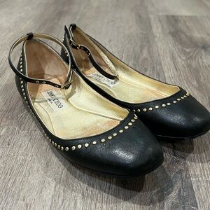Jimmy Choo EU 37.5 US 6.5 Ballet Flat Ankle Strap Black Leather Gold Rivet Shoe