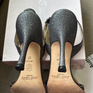 Step into sophistication with these Jimmy Choo heels, showcasing a sleek design with shimmering gray and silver tones. Perfect for formal occasions, these shoes feature thin, elegant straps and a medium to high heel for a touch of glamour. Experience the perfect blend of style and luxury with every wear. Excellent condition to upper and heals. Some bottom scuffing from normal light wear. Authenticated, original box included. Heal height 4.25”. BLOW-OUT SALE! I NEED TO PURGE MY CLOSET!