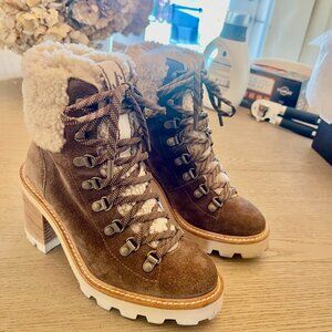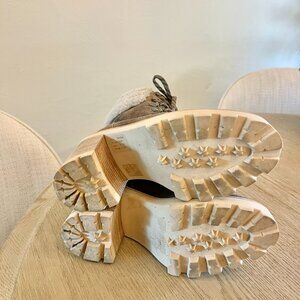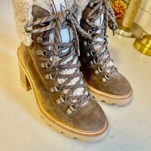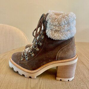 The Jimmy Choo Eshe 65 Shearling Boots are crafted in a Clay beige suede, featuring block low heels, closed rounded toes, front lace-up detailing, shearling trim, logo grosgrain trim on the tongue, leather lining, and rubber lug outsoles.