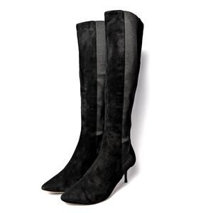 Jimmy Choo knee-high boots, Jimmy Choo Faith 85, black suede boots, pointed toe boots, 3 inch heel, pull-on boots, stretch panel boots, designer boots size, Italian suede boots, luxury suede knee boots, pre-owned Jimmy Choo, size 7 boots, Stiletto boots, kitten heel,