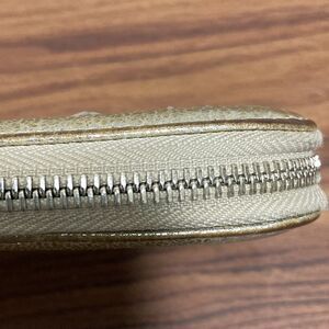 Normal signs of wear for a leather wallet. All corners are good, zippers are in working order. Some residue in zippered coin pocket. See picture. All star studs are in place.