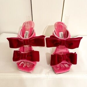 I’m excellent condition Jimmy Choo Flaca 100mm Velvet Bow Heels. Normal wear at inner soles and bottom soles.