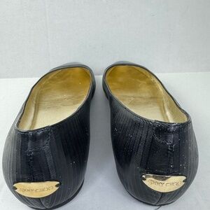 These Jimmy Choo flats showcase a refined black leather construction with a rounded toe, embodying a classic and versatile style. Perfect for everyday wear, they offer both comfort and sophistication. The timeless silhouette reflects the brand's commitment to elegance and quality.