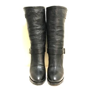 Guaranteed authentic. Size 38.5 Jimmy Choo "Galen" black leather boots with gold hardware. Never worn - no scuffs or marks on shoes! 4.5" heel height and rubber tread sole for traction. Perfect for winter weather days where you don't want to compromise your street style! Slip on style with two buckles. Mid-calf height. Soft black leather moto-style boot with slim heel.