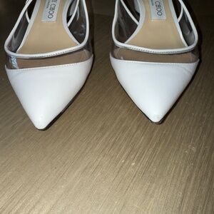 Gorgeous and elegant Jimmy Choo “Gemma 40” slingbacks in white nappa leather with clear plexi detailing. Worn only twice — very gently used and in excellent condition. Clean uppers, beautiful pointed toe, and comfortable 40mm heel.