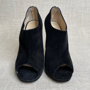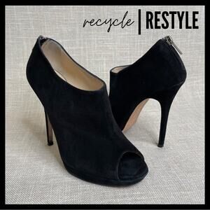 100% Authentic Jimmy Choo Glint Peep Toe Stiletto Booties in Black Suede Leather & Gunmetal Hardware. Women’s size 38.5 / 8.5 but runs small. Excellent condition, heels taps just needs to be replaced. Heel height is 5”.
