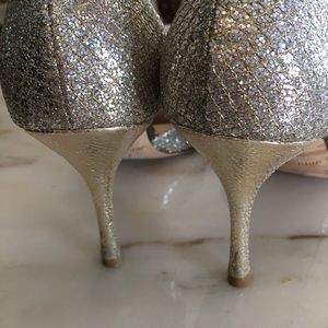 Instantly chick peep toe pump crafted of glitter fabric with a mesh stitched overlay. Beautiful shoes to bring sparkle to your party outfit. Textured metallic leather heel 2" 3/4. Worn only twice.