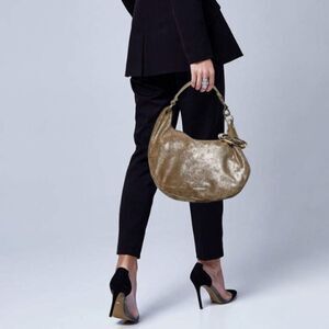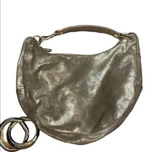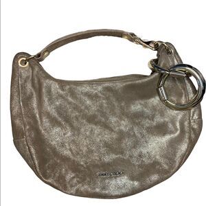 Shimmer your way through the day with this classic Jimmy Choo hobo bag. Made from leather its shimmering gold tone exterior is designed with complementing gold tone hardware and removable oversized bangles. Zip closure . Interior is suede lined. Includes original dust bag. Any question, feel free to ask. Offers welcome!
