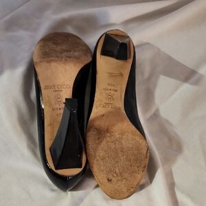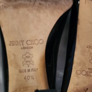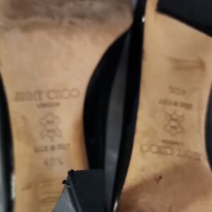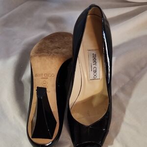 Chic glossy black heels by Jimmy Choo. Stylish peep toe design.