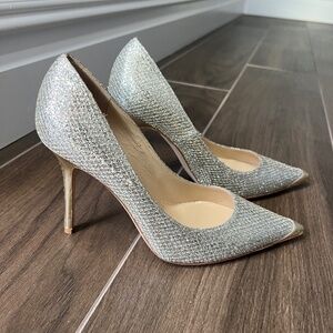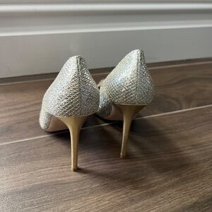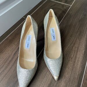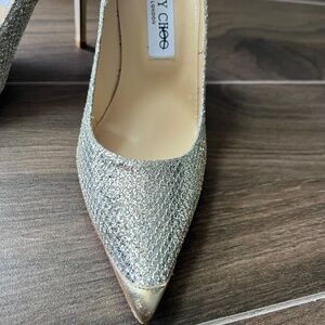 Jimmy Choo gold glitter pumps. Gold leather heels and gold leather tip. 4.25 in heel. Brand new. Never worn. Size 38