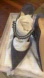 These Jimmy Choo mules in a sophisticated gray hue feature a striking chain-like metallic strap across the top, adding a touch of glamour. The sleek pointed toe design and rich color make them a versatile choice for various occasions.