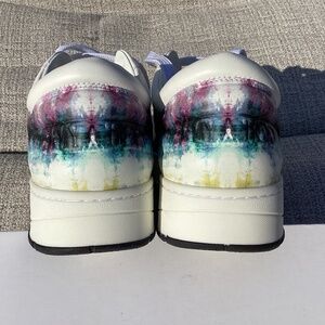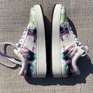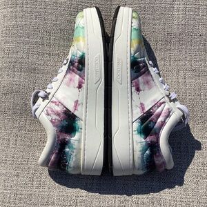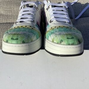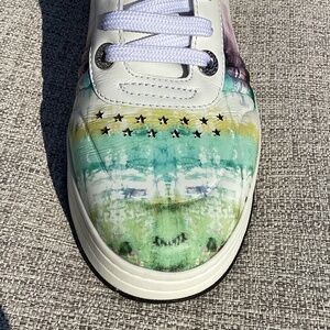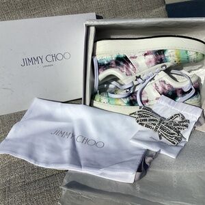 Gently worn ( couple times) these Jimmy Choo Hawaii Tie Dye sneakers are in excellent condition. Poised upon a chunky sole , tie dyed supple leather upper , padded collar , cushioned footbed , leather lining , round toe . Pave eyelets bring a touch of glamour to these sneakers. Small scuff marks on inside left shoe ( see pic ) comes with original box , dust bag and extra set of laces with there own little dust bag. I’m original owner . Please look at all pics