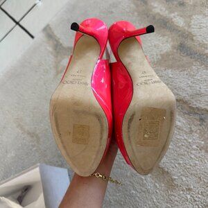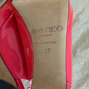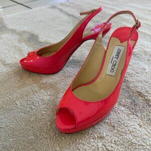 Jimmy Choo Hot Pink Patten Leather Open Toe Sling Back Pumps sz 37 w/box & bags