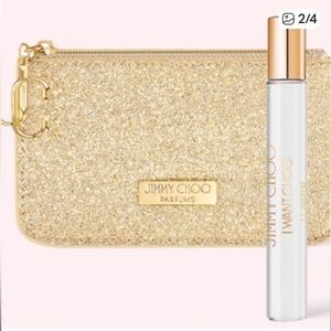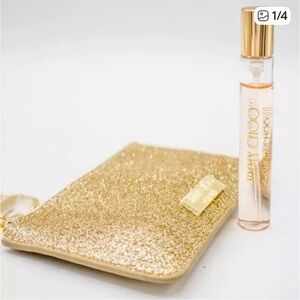 Experience luxury with the Jimmy Choo Gold Glitter Perfume Set. The Pouch is a beautiful Metallic Gold color and can easily fit your cash and credit cards. The Pouch measures approximately 5x3. The perfume is a 0.25oz spray, making this the perfect set for a small bag or a night out!