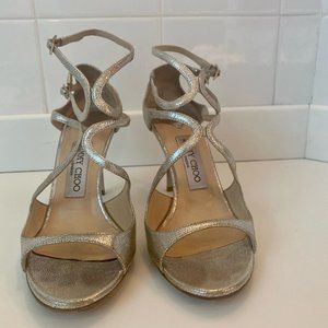 Jimmy Choo Ivette Champagne Glitter Leather Strappy Sandals. Worn once (for my wedding which I wore a heel protector with the whole time) Super comfy and absolutely gorgeous. In perfect condition...with a few toe marks on sandals. They are a very light champagne color with light gold heels.