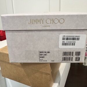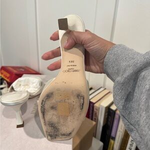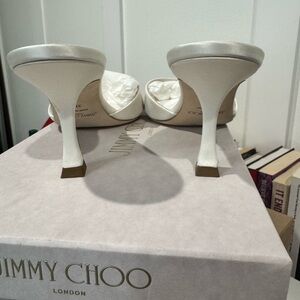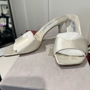 Chic ivory satin mules by Jimmy Choo. Elegant design with a sleek silhouette. Ideal for stylish outings. Worn once for bridal shower