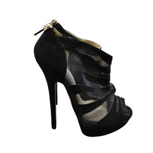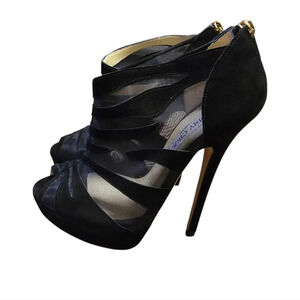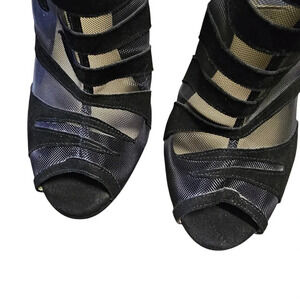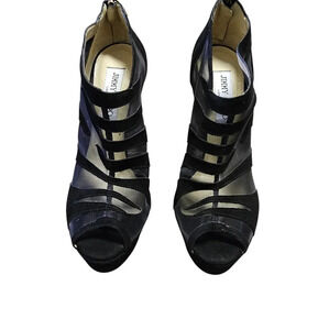 Jimmy Choo black suede and mesh high-heeled open toe booties.
