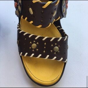 It’s from Jimmy Choo’s 2009 Spring Summer Collection. Studded & Whipstitch Accents, Stiletto Heels with Platform, Wrap-Around Straps & Buckle Closure at Sides. Heels 5.25”