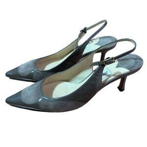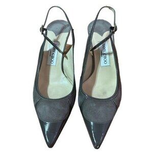 Jimmy Choo Leather Slingback Pumps Size 38.5 or US 8. Absolutely gorgeous suede and patent leather greyish brown nude point toe Slingback kitten heels in fantastic gently used condition. Vintage from Y2K.