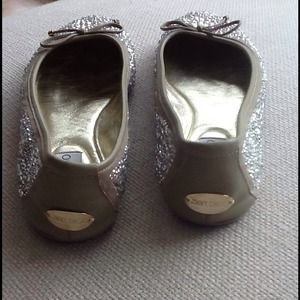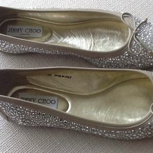 Jimmy Choo ballerina flats. Size 38 EUR. Beige Italian leather with all over clear Swarovski crystal embellishment. Leather back heel with gold logo plaque, rubber sole, padded insole, round toe with bow detail.