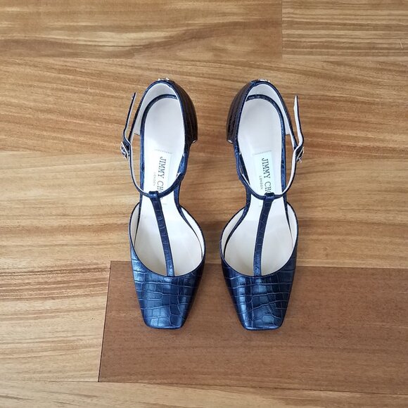 Elegant dark navy crocodile embossed leather pumps with 100mm heel, T- Strap.