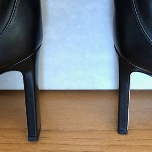 Crafted in Italy from black leather, they feature a slim block heel, soft square toe, and the label's logo in a glossy golden-toned initials standing tall at the top.