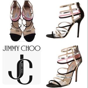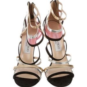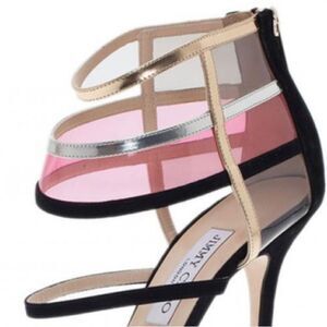 Make a statement with these Jimmy Choo Sandals on your next night out. They have black suede detailing, gold and silver leather straps as well as clear and transparent pink perspex panels giving them the perfect mix of colors. Their open toes are coupled back zipped closure and heels.