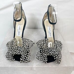 In excellent condition Rare and hard to find Jimmy Choo Mana 100mm Crystal Bow Heels. No missing crystals on the bow. Normal wear at bottom soles.