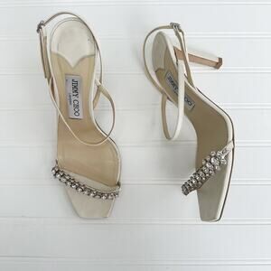 Jimmy Choo Meira 85 Heeled Sandals Off-White Latte Crystal Rhinestone Heels 38.5