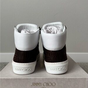 Condition brand new unworn. Stylish Jimmy Choo sneakers with a dark brown and white color scheme. Perfect for casual wear.